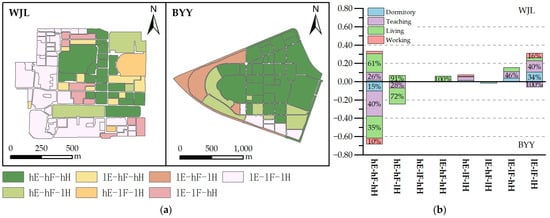 Multi-scenario clustering results of Tianjin University: (a) spatial distribution of cluster types in WJL and BYY campuses; (b) proportional distribution of cluster types in both campuses.