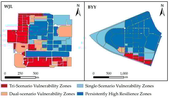Figure 9 shows that both campuses display three cluster types—hE-hF-hH, hE-hF-lH, and lE-lF-lH. The lE-hF-lH type is specific to BYY Campus, while hE-lF-lH, lE-hF-hH, and lE-lF-hH are found exclusively at WJL Campus. Moreover, units with low UCMR values in at least two disaster scenarios (2l-h/3l) comprise 52.6% of the WJL Campus area. In contrast, 92.7% of the BYY Campus area is occupied by units exhibiting high UCMR in at least two disaster scenarios (2h-l/3h), predominantly in the hE-hF-hH cluster (68.3%). These findings indicate that the UCMR of the WJL Campus is unstable under multiple disaster scenarios. Its morphological units show significant fluctuations in UCMR across different disaster situations and are mainly concentrated in l-dominant cluster patterns. Across three disaster scenarios, the UCMR of the BYY Campus maintains a high degree of consistency and stability, with most units belonging to h-dominant cluster patterns.
