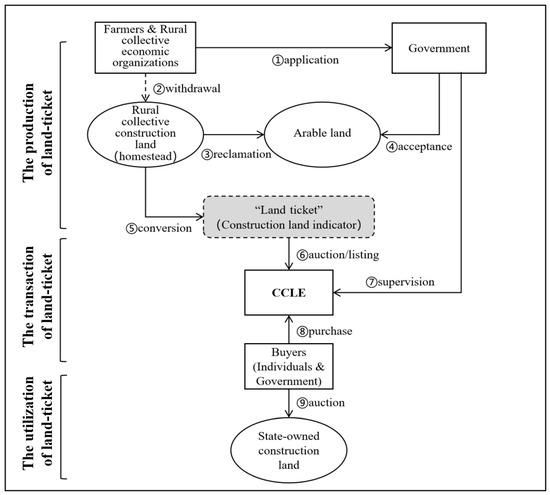 In addition to promoting nationally uniform policies, the central government in the same year authorized select local governments to experiment with policy innovation based on the IDUL framework. These adaptations aimed to explore market-based mechanisms for the exchange of rural and urban construction land, serving as a pilot effort toward the broader marketization of land factor allocation. Among the pilot regions, Chongqing Municipality proposed a comprehensive plan centered on the construction of public housing, land system reform, and “hukou” (a kind of household registration) system reform3. The aim of the land system reform is to encourage a segment of farmers to relinquish their homesteads, converting their land into capital for urban immigration. This process is complemented by granting urban “hukou” to facilitate their transition from rural to urban residents. Ultimately, public housing projects will be developed in cities to accommodate the increased number of urban residents resulting from this policy [15]. As the core driving force for implementing this comprehensive plan [16], the specific operations of the land system reform in Chongqing Municipality have been named the “Chongqing land ticket model” by local officials. Under this model, farmers are able to apply for the reclamation of their homesteads, thereby converting the usage rights of homesteads into a “land ticket (a certificate equivalent to urban construction land indicator)”. Additionally, land tickets can be traded on designated platforms.