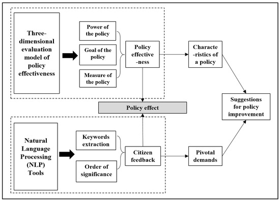 As mentioned earlier, we aim to conduct a systematic evaluation of the Chongqing land ticket model using a multi-dimensional framework that integrates policy effectiveness and citizen feedback. To assess policy effectiveness, we evaluated its power, goals, and measures, summarizing the key features of the policy design. For the citizen feedback assessment, we employed natural language processing (NLP) techniques to extract and rank keywords from the feedback data, identifying the core demands of the policy recipients. Together, these two dimensions form a dual-evaluation framework for assessing the effect of policy, which serves as the foundation for proposing subsequent policy improvement recommendations (Figure 2).