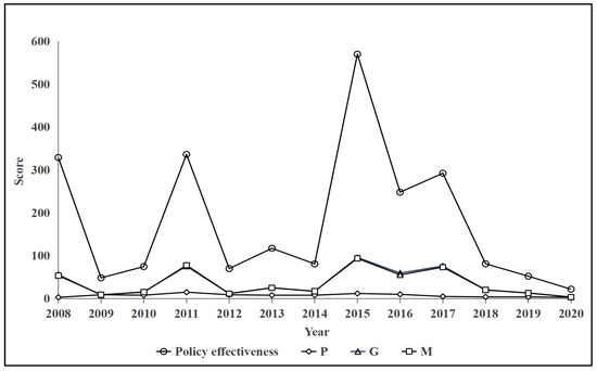 Effectiveness score of Chongqing land ticket policies from 2008 to 2020.