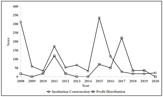 - The focus of policy effectiveness allocation has undergone a notable shift. The Chongqing land ticket model, which relies on institutional safeguards at one end and is closely tied to public welfare at the other, has placed significant emphasis on grassroots-level land reclamation and land ticket trading rules, as well as fund settlement and income distribution for farmers. Furthermore, from a temporal perspective, 2017 marks a pivotal turning point in the orientation of the policy effectiveness (Figure 5). Around this year, the emphasis of policy implementation transitioned from accelerating institutional construction to enhancing the income rights and interests of farmers. This shift occurred because, following the overheating of the trading market, farmers’ awareness of property rights gradually increased. At this time, concentrated feedback regarding issues such as non-standardized reclamation procedures and prolonged compensation payment cycles prompted policymakers to implement moderate reforms in the land ticket model, thereby addressing relevant complains.