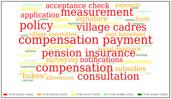 After statistical analysis, “compensation payment” emerged as the most significant keyword in political consultation texts, with a corresponding TF-IDF value of 0.05616 (Table 6). According to the TF-IDF algorithm, the importance of a word in a specific text is directly proportional to its term frequency and inversely proportional to its document frequency across the entire corpora. Compared to methods that calculate word importance based solely on frequency, the TF-IDF algorithm assigns higher weights to words with stronger predictive power for the text’s theme. This explains why, despite higher frequencies for terms like “policy” (n = 723) and “measurement” (n = 336), the more thematically relevant term “compensation payment” (n = 332) receives a higher weight after inverse document frequency normalization. Additionally, semantically related terms such as “compensation” and “subsidies” form the “economic compensation” category (Figure 6), which achieves the highest TF-IDF value among all categories at 0.16415.