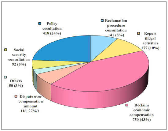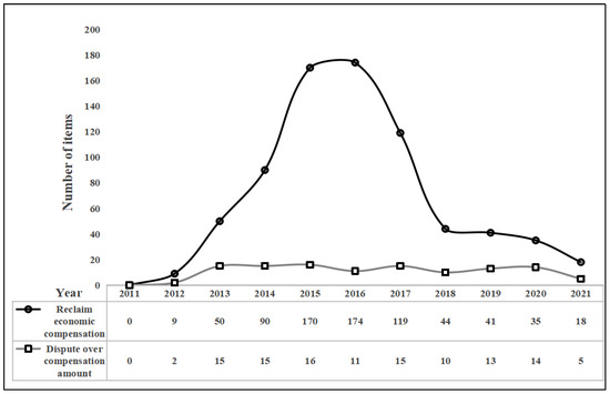 Therefore, we meticulously reviewed all feedback information item by item. Through analyzing the textual content and specific context of each piece of feedback, we categorized the feedback related to “compensation payment” into two primary types (Figure 7). The first type pertains to the reclaiming of economic compensation. Specifically, this reflects farmers’ demands for overdue land ticket payments after completing transactions, with the hope that local government will promptly distribute the delayed compensation. For instance, one farmer posted online: “… Our family actively responded to the government’s policy on relocating dilapidated houses. Like others in our community, we borrowed money to move into a new house and agreed to let the government demolish our old house (referring to the homestead). We expected to quickly receive compensation from the government to repay our debts. However, nearly a year has passed since the land-ticket transaction was completed, and we still haven’t received any compensation. … Now I’m facing a severe debt crisis. I hope the relevant departments will no longer delay issuing my compensation.” This type of feedback typically arises when local governments fail to adhere to their promised timelines for compensation allocation. Since farmers lack the ability to ensure compliance with prearranged plans, they resort to expressing frustration, describing their difficulties, and seeking attention from department leaders via online platforms.