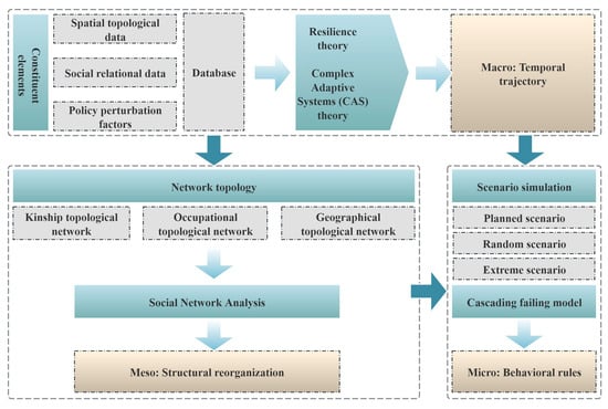In summary, as shown in Figure 1, this paper establishes an analytical framework composed of “macrolevel temporal trajectories, mesolevel structural reorganization, and microlevel behavioral rules” to analyze the spatial adaptability evolution mechanism of traditional villages under changing social relationships. At the macrolevel, spatial topology characteristics are extracted from multisource heterogeneous data (such as satellite imagery and field surveys). A social relationship adjacency matrix is constructed through in-depth interviews, and social disturbance nodes (e.g., thresholds for changes in the household registration system) are identified from policy documents. Based on complex network theory, a dynamic topological network is established to interpret its spatiotemporal evolution pathways. At the mesolevel, a three-dimensional network analysis model (kinship, occupational, and geospatial networks) is introduced, which integrates social network analysis to quantify network evolution characteristics and reveal mechanisms of spatial adaptability. At the microlevel, a cascade failure model is employed to simulate the coupling behavior of actors and space under three stress scenarios: planning-driven, random disturbance, and extreme pressure. By quantifying system adaptability, key nodes within the system are identified, which informs the development of an adaptive planning intervention framework.