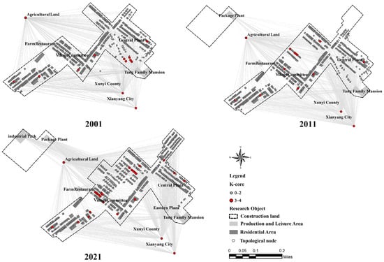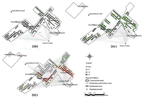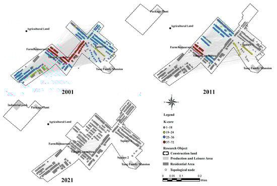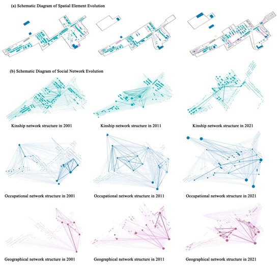 The years 2001, 2011, and 2021 were selected as time points for observing the evolution of social relations and village space, and the evolution diagram of the relationship topology network and village spatial structure of Tangjia Village is depicted in Figure 4.