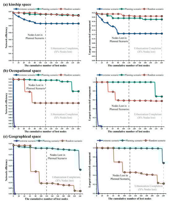 As shown in Figure 8a, under the planning scenario, the kinship network exhibits high connectivity and resilience. In the orderly attack stage, both the network efficiency and the largest subgraph proportion remain stable, indicating that the core clan nodes play a key role in maintaining the overall connectivity and social support of the network. When the node attack rate approaches 60% (the rate at which urbanization is completed), although network efficiency and the largest subgraph proportion decrease to 72.43% and 88.13% of their initial values, respectively, they still maintain adequate capacity for resource transfer and social connection. In the random scenario, network efficiency and the largest subgraph proportion decline only slightly to 96.55% and 94.45% of their initial values after a random loss of 30% of nodes, reflecting strong kinship ties within Tangjia Village. However, under extreme adverse conditions, once the core clan nodes of the village are lost first, the buffering and recovery capacity of the kinship network will be greatly reduced. Such nodes account for about 21% of the total, and their loss will lead to a lack of sufficient resilience in the face of adverse changes. Therefore, there are about 80 key nodes in the kinship network, mainly located in the clan settlement area in the south of the village. These nodes serve as bridges between distinct kinship groups, facilitating the transmission of shared values, rituals, and collective memory. Consequently, they function not only as spatial and relational hubs but also as key anchors of villagers’ emotional ties and sense of cultural belonging.