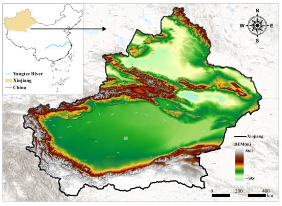 Xinjiang (34°25′~48°10′ N, 73°40′~96°18′ E) is located in the hinterland of the Asian–European continent (Figure 1), with a general geomorphological profile of “three mountains and two basins”, with the “three mountains” referring to the Altai Mountains in the north, the Tianshan Mountains in the center, and the Kunlun Mountains in the south, while the “two basins” refer to the Junggar Basin to the north of the Tianshan Mountains and the Tarim Basin to the south of the Tianshan Mountains; mountainous areas account for 43% of the area of the whole region and basins account for 57%. Xinjiang is an important corridor of the Silk Road and the province with the longest border in China, with a prominent ecological location and geostrategic position. The ecological environment of Xinjiang is fragile, with desert accounting for more than 60% of the total area, low vegetation cover, and uneven spatial and temporal distributions of water resources; the rivers are mostly recharged by glacial snowmelt, with the region being characterized by “drought in spring, flooding in summer, scarcity in autumn, and dryness in winter” [24]. At the same time, the region has a temperate continental climate, high aridity, and low rainfall, with an average annual precipitation of about 135.31 mm. It has the highest annual sunshine hours (2550–3500 h) and the second-highest solar radiation in the country; the average annual sunshine hours in the desert areas amount to 3200–3400 h, and most of this area belongs to the Class I solar energy resource area. Xinjiang has a vast territory with rich desert land resources, and its theoretical reserves of solar energy resources account for 40% of the national technically developable amount, ranking first in the country and providing unique conditions for the development of large-scale PV applications. Xinjiang’s PV industry in the desert, and other non-cultivated land has the potential to achieve large-scale deployment, relying on “PV + sand control”, “PV + ecological restoration”, and other modes, not only promoting the development of new energy but also improving the local ecological environment to a certain extent. It has thus become an important demonstration of PV ecological construction in China.