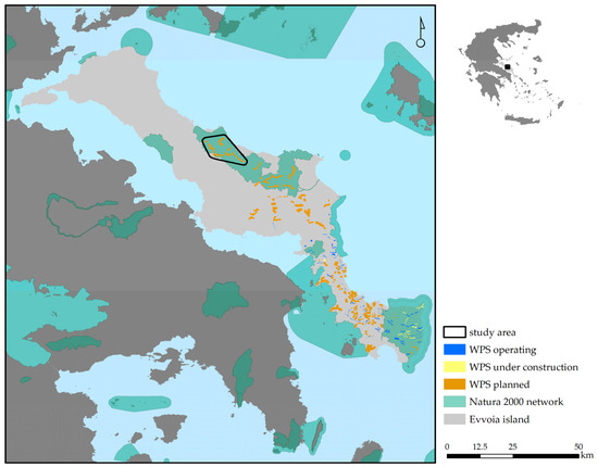 Study area in Evvoia Island (Greece), indicating the Natura 2000 network and the operating, under construction and planned wind power stations (WPS) on the island.