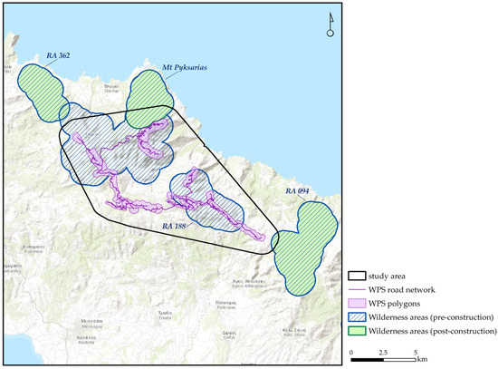 The project greatly overlaps (64%) with the two roadless areas, considered wilderness areas (Table 2, Figure 2). The total cover of wilderness areas is going to be reduced from 55.9 km2 to 4.6 km2 in the study area, corresponding to a twelve-fold decline in roadless cover from 49% to 4% (RFI). The large wilderness area of Mt Pyksarias would be reduced to one smaller patch of 12 km2 (4.1 km2 within the study area) after the WPS construction, accounting for 23% of its initial size (51.4 km2). Moreover, a smaller wilderness area (16.1 km2) would be totally lost, but two vicinal roadless areas would not be affected (Figure 2).