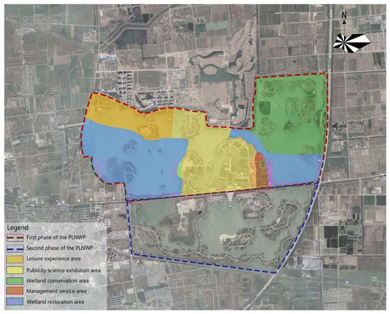 The park covers a total area of 466.7 hectares and includes five functional zones: wetland conservation area, wetland restoration area, publicity science exhibition area, leisure experience area, and management service area (Figure 2). The wetland conservation and restoration areas together account for 311.7 hectares, or 66.8% of the total park area. The park attracts visitors through its innovative and orderly open spaces and waterside areas. It creates a city landmark for ecological tourism by integrating material spatial elements such as water landscapes, waterside shorelines, plant diversity, and rich landscape features. The construction of the wetland park not only improves the mining area’s environment but also provides surrounding residents with green spaces for leisure, entertainment, and social interaction. It also increases employment rates, improves infrastructure, and enhances the living environment.
