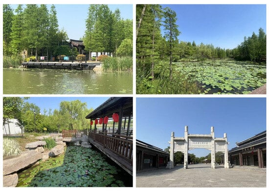 In China’s eastern Huanghuai plain, the groundwater table is relatively high. Underground coal mining activities have led to frequent ground subsidence. This has created numerous coal mining subsidence wetlands. These wetlands have gradually evolved into unique water–land composite ecosystems []. Coal mining subsidence wetland parks serve as an ecological restoration method for post-mining landscapes. Researchers have been focused on the issues caused by the subsidence wetlands, such as the evolution of coal mining subsidence wetland distribution [], water pollution [], farmland destruction [], vegetation productivity decline [], and animal habitat loss []. However, coal mining subsidence wetlands are believed to offer significant environmental, economic, and social value after restoration since they are a special part of the urban green space system. Many studies have addressed that coal mining wetlands not only enhance the function of the ecosystem service but also play a crucial role in maintaining the history and culture, promoting ecological civilization, and shaping the image of the city [,]. For example, they are reused by local residents and have become a new impetus for urban ecotourism in Xuzhou [], Huaibei [], Jining [] and many other coal resource-based cities [,] in China.