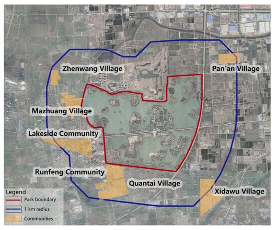 To account for variations in survey results due to different holidays and time periods, the questionnaire survey was conducted during the National Day holiday, as well as on regular weekends and weekdays afterward. Specifically, the distribution of questionnaires was as follows: National Day Holiday (4–6 October 2024): 50% of the questionnaires were distributed during this period due to higher visitor traffic. Regular weekends (13–14 and 20–21 October 2024): 25% of the questionnaires were distributed. Regular weekdays (22–26 October 2024): The remaining 25% of the questionnaires were distributed. Visitor questionnaires were distributed across various functional zones within PLNWP. Local resident questionnaires were distributed within a 1-km radius (15-min living circle) from the park boundary, covering seven surrounding communities. These included five villages (Zhenwang Village, Mazhuang Village, Xidawu Village, Pan’an Village, and Quanta Village) and two resettlement communities (Hubin Community and Runfeng Garden) (Figure 6).