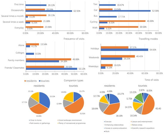 After the survey was completed, the questionnaires were checked to ensure all questions were answered accurately and were suitable for statistical analysis. The basic information of the respondents is shown in Table 3. Overall, the gender ratio of the respondents is balanced, with the majority being employees of enterprises and institutions, students, and retirees. The respondents cover a wide range of ages, and the educational level is concentrated in those with college degrees and above, accounting for 47.40%. Since the student group has no income, the majority have a monthly income of less than 2000 yuan, accounting for 41.15%. As shown in Figure 7, there are significant differences in the usage characteristics between visitors and local residents.