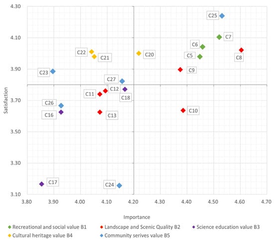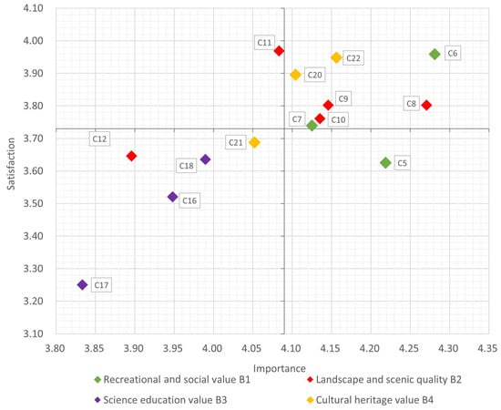 Quadrant III includes five indicators: Public Art Significance (C12), Completeness of Educational Facilities (C15), Completeness of Interpretive Systems (C16), Perceived Participation in Experiential Learning (C17), and Historical Continuity (C21). These indicators have low importance and low satisfaction. The reason is that tourists focus on the wetland landscape and factors that have direct sensory contact. Science popularization and historical culture do not directly affect visitors’ experience. So, dissatisfaction with these factors is usually fleeting. Therefore, PLNWP should enhance science popularization and educational publicity and make gradual improvements.