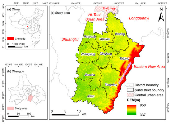 Location of study area. (a) Position of Chengdu in China; (b) location of the study area within Chengdu; (c) enlarged map of the study area and its digital elevation model (DEM).