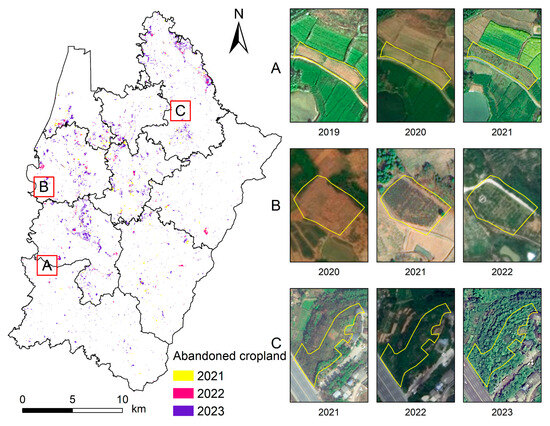 CA is generally defined as the cessation of agricultural activities with no visible cultivation signs and an absence of direct human influence [18,78,79]. However, the literature lacks a unified precise definition, with primary variations occurring in the threshold duration of discontinued cultivation [30,39,63]. In this study, we adhered to the Land Administration Law of the People’s Republic of China, which mandates that no entity or individual shall leave cropland idle or barren. Croplands unused for two consecutive years may be reclaimed by local governments without compensation. To clarify, in this study, “unused” refers to land that has not been cultivated with crops, including both food crops and vegetables. This excludes seasonal fallow and crop rotation, which are not considered abandonment. To enhance operational clarity, we define CA as the conversion of active croplands to grassland, forest, or bare land for ≥2 consecutive years based on land use change trajectories, consistent with established methodologies [24,61,62]. Importantly, conversion does not require the same non-cultivated land type for two consecutive years. For example, if cropland is converted to grassland in the first year and then changes to forest in the second year, it qualifies as abandonment. However, a cycle such as cropland → grassland → cropland would not be considered abandonment, as the land returns to cultivation. In our study, we specifically focused on three non-cultivated land types—grassland, forest, and bare land—to define CA. This is based on the land use change dynamics that occur after cultivation ceases: vegetation gradually withers, turning into bare land, or vegetation succession occurs, leading to the development of grassland or forest through human interventions such as planting trees or sowing grass. If any land within the two-year trajectory shifts to land use categories such as “others” (e.g., commercial, industrial, residential, public service, or transportation land), it is excluded from the abandonment classification due to the irreversible nature of these land use changes. Using spatial overlay analysis of 2019–2023 land use data, we identified annual distributions of abandoned croplands (Figure 2). The abandonment rate—calculated as the abandoned area in the target year divided by the baseline cropland area [13,67]—quantified abandonment intensity. This yielded three annual CA maps (2021–2023).