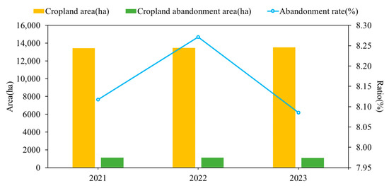 Based on the extracted CA data (Figure 3), our analysis reveals that the abandoned cropland area in the study region measured 1113.30 ha in 2021, 1120.01 ha in 2022, and 1086.30 ha in 2023, corresponding to abandonment rates of 8.12%, 8.27%, and 8.09%, respectively. These figures demonstrate a slight initial increase followed by a marginal decrease overall (Figure 4).