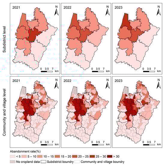 Table 3 presents descriptive statistics of abandonment rates at different administrative scales. At the subdistrict level, mean abandonment rates remained stable at approximately 12% across all three years, slightly lower (by <2%) than corresponding averages at the community/village level. However, the standard deviation at the community/village level exceeded twice that of the subdistrict level, indicating substantially greater spatial variability in abandonment rates at finer administrative scales.