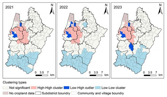 where I and Ii represent the global and local Moran’s I indices, respectively, where n denotes the total number of spatial units, xi and xj indicate the abandonment rates of spatial units i and j, is the mean abandonment rate, and Wij stands for the spatial weight matrix. The Moran’s I statistic ranges between [−1, 1], with values greater than 0 indicating positive spatial autocorrelation (clustered pattern), values less than 0 showing negative autocorrelation (dispersed pattern), and 0 suggesting no autocorrelation (random distribution) [82]. For the local indicator Ii, positive values signify that spatial units with similar values tend to cluster together (either high–high or low–low aggregation), while negative values imply they tend to disperse (high–low or low–high dissimilarity). For instance, if a spatial unit exhibits high cropland abandonment, its adjacent units would typically show low abandonment rates, and vice versa.
