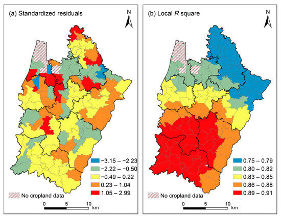 We further employed GWR to investigate the determinant factors of CA in the study area. The parameter estimates from GWR (Table 5) demonstrate strong model performance, with high R2 (0.832) and adjusted R2 (0.743) values, along with a highly significant F-test (p < 0.001), indicating excellent model fit. Spatial analysis of standardized residuals and local R2 values (Figure 8) reveals that standardized residuals ranged from −3.15 to 2.99, with approximately 97% falling within [−2.5, 2.5], while all local R2 values exceeded 0.75, collectively confirming the model’s overall robustness and suitability for regression analysis of CA patterns.