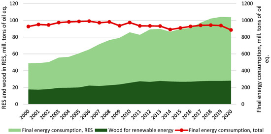 4.2. Trends in Renewables Consumption and Wood Used for Production of Wood Products and Energy