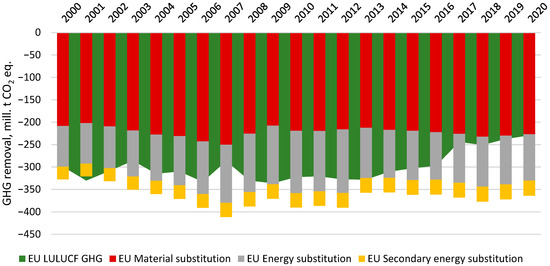 4.3. Substitution Effect of Wood Biomass Used for Material and Energy Production in the EU