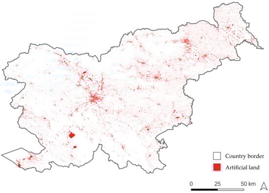 Overall, the document introduces proposals for institutional, legal, informational and financial foundations to enable a transition to sustainable, data-driven and inclusive spatial governance in line with the goals of no net land take and the preservation of high-quality land. As part of the development of the Strategic Plan for Circular Spatial Management 2024–2030 [20], an analysis of the state of artificial land in Slovenia was also conducted (Figure 1).