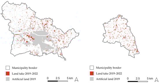 Land take between 2019 and 2022 in the Municipality of Maribor (left) and the Municipality of Kungota (right).