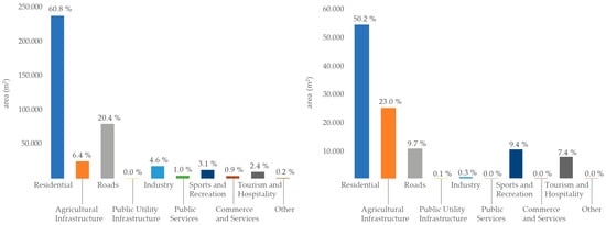 The largest share of newly artificialized land between 2019 and 2022 in both study areas corresponds to residential areas, accounting for 60.8% in Maribor and 50.2% in Kungota (Figure 5). In Maribor, a substantial share (20.4%) of land take is attributed to road infrastructure. Agricultural infrastructure represents 6.4%, industry 4.6%, and sport and recreation 3.1% of land take. The presence of other land use appears in smaller proportions. In Kungota, a significant share (23%) corresponds to the expansion of agricultural infrastructure, often associated with the development of supplementary tourism and hospitality activities. Roads represent 9.7%, sport and recreation 9.4%, and tourism and hospitality 7.4% of land take.