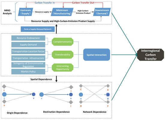 Carbon transfer embodies the spatial redistribution of carbon emissions resulting from interregional economic activities and trade. In recent years, accelerated regional integration and deepening specialization within industrial chains have rendered traditional bilateral analytical frameworks inadequate for capturing the complexity of interregional carbon transfer networks. This evolving context necessitates the incorporation of spatial interaction effects to elucidate the multi-nodal and multi-pathway characteristics inherent in contemporary carbon transfer patterns. Based on the spatial interaction theoretical framework and a multiregional input–output (MRIO) model, we analyze the spatial dependence characteristics of interregional carbon transfer in China. The results reveal that interregional carbon transfer in China exhibited an upward trend from 2012 to 2017, demonstrating statistically significant positive origin dependence, destination dependence, and network dependence. The distance between regions exerts a significantly negative influence on interregional carbon transfer. Interregional carbon transfer is not merely a bilateral phenomenon; its fundamental nature is characterized as a network phenomenon. Our study demonstrates that precise regulation of the allocation of industrial land and transportation infrastructure land, strengthening the decisive role of market mechanisms in resource allocation for regional low-carbon development, and establishing interregional collaboration mechanisms for low-carbon exchange can effectively reduce the occurrence of interregional carbon transfer. These findings provide policymakers with more precise information to achieve equitable carbon emissions distribution across regions.