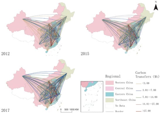 Interprovincial carbon emissions driven by trade activities in China have shown a consistent upward trend, although the rate of increase has gradually declined in recent years. In 2012, trade-related carbon emissions amounted to 4406.775 Mt, rising to 4825.485 Mt in 2015 and further to 4954.605 Mt in 2017. The trend of change is consistent with the findings of existing studies []. From a spatial perspective, carbon transfer primarily occurs between central China and the eastern coastal regions, while transfers involving the western regions are relatively minimal. In 2012, most interprovincial carbon transfer occurred within the eastern region of China. By 2017, carbon transfers between the eastern and central regions had significantly increased, revealing a spatial trend characterized by “westward” and “northward” movements of carbon flows.