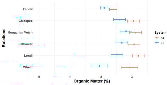 Soil organic matter (%) at 0–40 cm within different two-year wheat-based crop rotations under CA and CT systems.