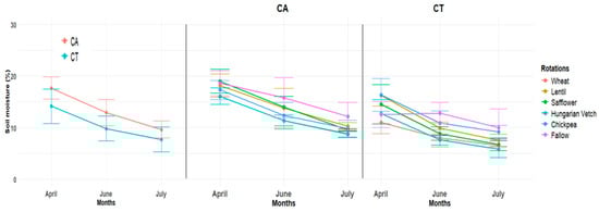 The soil organic matter content in two-year rotation plots was significantly greater under CA compared to CT within each crop rotation in the sixth experimental year (Figure 2). The organic matter content of the plots managed under CA ranged from 2.5 to 3.1%, while under CT the content was between 1.9 and 2.8%. Wheat–lentil rotation when managed under CA had the highest organic matter content, while the wheat–wheat rotation under CT had the lowest OM. Soil moisture was also improved under CA (Figure 3). In all months, the soil moisture on plots under CA was greater than under CT. While there were differences among the rotations under CT, there were no significant differences among the rotations in terms of soil moisture under CA system.