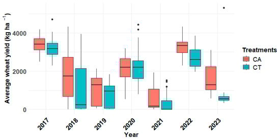 Wheat yields fluctuated greatly under both systems over the years, but these variations did not correspond to annual rainfall patterns (Figure 4). The apparent low medians in 2018 and 2021 are a result of extremely dry climatic conditions during those years, which significantly reduced yields. The greatest yields were in 2017 at 3.2 and 3.4 t ha−1 for CT and CA, respectively. Over the seven-year duration of the experiment, the average cropping season (October to July) precipitation was around 227 mm, and most years received from 213 to 288 mm of precipitation, except in 2020/2021 where the precipitation was only 118 mm (Figure 1).