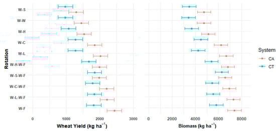 Estimated marginal means (EMMs) of seven-year average wheat yield and biomass under conventional tillage (CT) and conservation agriculture (CA), calculated from a linear mixed model. Error bars represent standard errors of the EMMs. Crop rotations include combinations of wheat (W), safflower (S), Hungarian vetch (H), chickpea (C), lentil (L) and fallow (F).