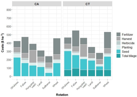 All rotations were more profitable under CA than CT. The production costs for CA were 9 to 15.2% less than the costs in CT (Figure 6). This was mainly due to the tillage expenses, which involved around three or four operations. Within each rotation, tillage costs represented 15 to 28% of total costs. Safflower production cost was the lowest due to its low seed cost. Wheat–fallow and wheat–wheat rotations had the highest production costs due to extra need for fertilizers.