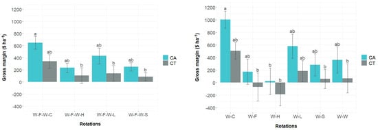 Average gross margin (USD ha−1) of two- and four-year rotations. Bars labeled with different letters are significantly different (Tukey’s HSD test, p < 0.05).