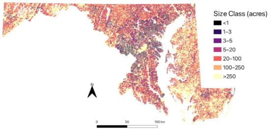 Map of Maryland’s land ownership by size class in acres. Figure was created from all ownerships merged by name and address, excluding unknown ownership.