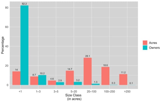 Percentages of owners and area in each acreage size class in Maryland, USA. Figure was created from all ownerships merged by name and address, excluding unknown ownership.