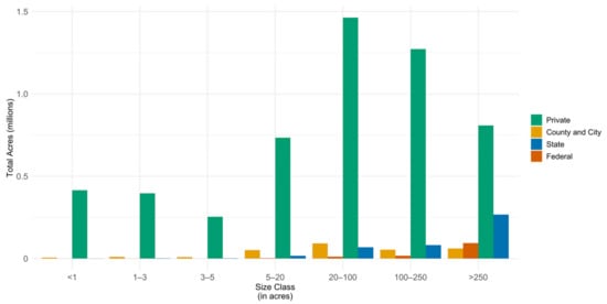 Land area by size class and ownership entity (private, federal, state, and city/county) in Maryland, USA. Figure was created from all sizes of ownerships before merging, including parcels with unknown ownership.