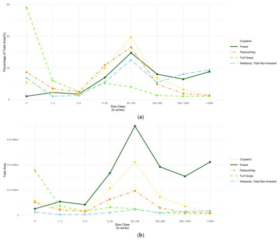 Land cover distribution by size class: (a) percentage of the total area for each land use, and (b) total land area. Data includes all ownerships greater than 0.5 acres merged by owner name and address, excluding unknown ownership.