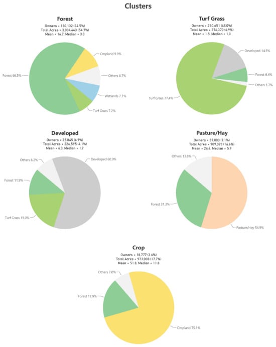 The clustering analysis reveals distinct patterns of ownership groups sharing common land use and land cover characteristics. Although almost all properties consist of a mix of land covers, they are each characterized by a dominant land cover: (1) forest, (2) turf grass, (3) developed, (4) hay/pasture, and (5) cropland. Each cluster has other land covers associated with them in differing proportions (Figure 6). These clusters, derived from hierarchical clustering of aggregated land cover data, reflect varying compositions, spatial distributions, property sizes, and ownership patterns (Figure 6, Figure 7 and Figure 8).