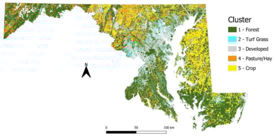 The clusters reveal significant disparities in total area (Table 5). The forest cluster predominates, covering 3,004,443 acres (54.7% of the state). Forest-dominant properties have notable concentrations in Western and Southern Maryland, the Northeast part of the state, and the lower Eastern Shore. Cropland and hay/pasture clusters occupy substantial but lesser areas, at 973,008 acres (17.7%) and 909,073 acres (16.6%), respectively. Cropland is concentrated in the Eastern region, particularly the northern portion, and it extends into Central and Southern Maryland’s rural zones. Hay/pasture is prominent in a central swath north of Washington, D.C., intermingling with cropland in Central Maryland and forest in the Western region, with smaller pockets adjacent to cropland in the Southern and Eastern areas. In contrast, the turf grass (376,370 acres, 6.9%) and developed (226,595 acres, 4.1%) clusters are the smallest, predominantly located in urban and suburban areas around Washington, D.C., Baltimore, and other cities like Frederick and Hagerstown.
