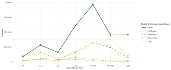 Our analysis revealed three patterns in the distribution of major land cover classes by size class: (1) a bimodal pattern for forests and tidal wetlands, (2) a unimodal pattern for crops and hay, and (3) a left-skewed distribution for turf grass (Figure 5). The bimodal distribution in the forest and tidal wetland land cover classes shows significant portions of the total acreage concentrated in two size categories: the 20–100-acre range and the greater than 1000-acre range. We found a unimodal pattern among cropland and pasture/hay categories, represented by a curve that is highest in the middle at the acreage class of 20–100 acres. The left-skewed distribution of turf grass shows a generally decreasing percentage of land cover as size class increases. This pattern is only exhibited by turf grass and shows that holdings of turf grass are predominantly small parcels less than 3 acres, but with sizable components held in larger size classes of up to 100 acres.