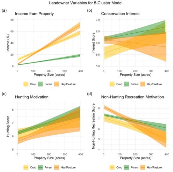 We employed univariate linear regression models to assess the predictive ability of clusters, with an interaction term for property size, on dependent variables including landowner motivations (e.g., income, hunting, recreation), income percentage from the property, conservation interest (the mean value of responses to 18 conservation practices), and perceived barriers (e.g., wildlife damage, labor). Models were evaluated for fit using R2 and significance of predictors (p < 0.05).