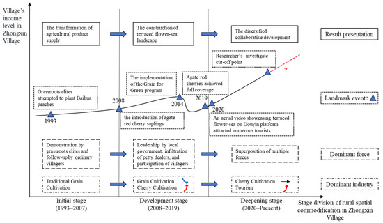 Through the systematic summarization and analysis of the research materials, the researchers clearly discerned that the process of rural spatial commodification in Zhongxin Village was not accomplished in a single action; rather, it exhibited a trend of gradual advancement, dynamic development, and continuous evolution. This study categorized the evolution process of rural spatial commodification in Zhongxin Village into three key stages from four dimensions: dominant industries, dominant forces, landmark events, and result presentation. The landmark events for dividing stages are as follows: (1) In 1993, a small number of grassroots elites in Zhongxin Village first attempted to plant Baihua peaches, an economically valuable fruit tree. After several years of promotion and development, the planting area rapidly expanded to approximately 300 mu, laying a solid foundation for the cultivation of economically valuable fruit trees in the region. (2) In 2008, the Ziqiang Hydropower Station construction project commenced. As part of the compensation and resettlement plan for villagers affected by land acquisition and demolition, the local government provided cherry saplings to rural households, which initiated the preliminary exploration of characteristic agricultural planting and laid the foundation for the subsequent large-scale development of the industrial structure. (3) In 2014, with the in-depth implementation and comprehensive implementation of the Grain for Green Program, and driven by the effective incentives of related subsidy policies, an increasing number of farmers in Zhongxin Village joined the field of cherry cultivation. Gradually, a large-scale production pattern and market-oriented sales channels were formed. (4) In 2019, after years of exploration and promotion, the cultivation of agate red cherries achieved full coverage in Zhongxin Village. With the upward trajectory of the planting scale, the persistent refinement of planting technology, and the progressive broadening of sales channels, the cherry industry has become increasingly prominent in the economic landscape of Zhongxin Village and even the entire Wahe area. It has firmly established itself as a cornerstone industry that propels local economic growth, empowers villagers to boost their income, and paves the way for prosperity. (5) In 2020, an aerial video showcasing the spectacular landscape of the terraced flower sea in Zhongxin Village attracted extensive attention on the Douyin platform, and a great number of tourists flocked to Zhongxin Village for sightseeing and leisure. Zhongxin Village accurately captured the opportunities for rural tourism development, actively implementing projects such as infrastructure construction, the village’s aesthetic appeal enhancement, and tourism reception facilities improvement, thus officially embarking on the characteristic development path of “agriculture–tourism integration”.