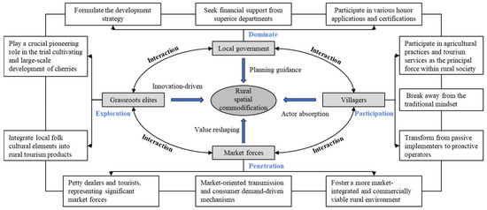 The phased evolution of spatial commodification in Zhongxin Village is fundamentally a consequence of the synergistic impetus provided by both endogenous and exogenous resources. Based on Lefebvre’s triadic dialectical framework for spatial production onto specific rural spatial scenarios, rural spatial commodification triggers profound changes in subject behaviors, social relations, and spatial practices, thereby generating significant shifts across the tripartite dimensions of perceived, conceived, and lived space. Within the coupled development of cherry cultivation and rural tourism, multiple actors, including local governments, grassroots elites, villagers, petty vendors, and tourists, endeavor to strike a balance between the “authenticity” and “commodification” of rural space through a series of differentiated action strategies [38]. This collective effort aims to achieve sustainable rural spatial commodification.