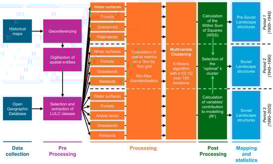 Land use and land cover data were derived from historical maps and open-access geographic databases (Figure 1). Historical maps were used exclusively for the pre-Soviet and Soviet periods due to their temporal archival value. The main challenge for the pre-Soviet period lies in sourcing data that are both available and consistent in terms of spatial resolution, geographic information, and production dates, particularly between the two areas formerly under the control of the Kingdom of Prussia and the Russian Empire.