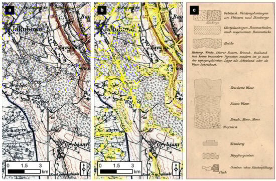 Preprocessing of historical maps for modelling landscape structures: (a) extract of the “Schattern–Korciany” sheet (1914) from the 1:100,000 Karte des Deutsche Reiches series after georeferencing, (b) digitisation process of spatial features relating to land use and land cover, and (c) extract of the nomenclature [] for identifying land use and land cover classes.